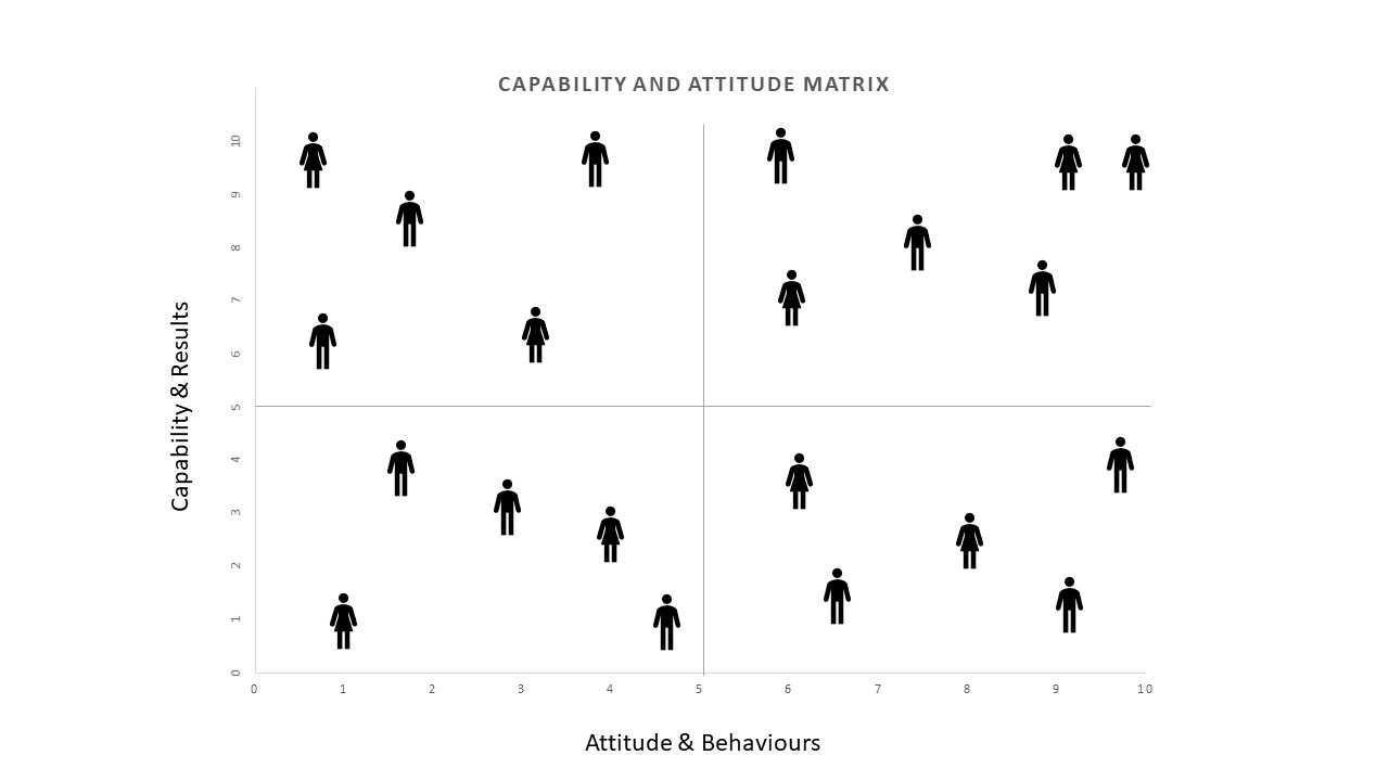 Those in the bottom right quadrant, above average in attitude but below average in capability and results, need individual action plans to build their capability. Those in the bottom left need individual plans too, but here, significant improvement in both areas in necessary if they are to remain on the bus.